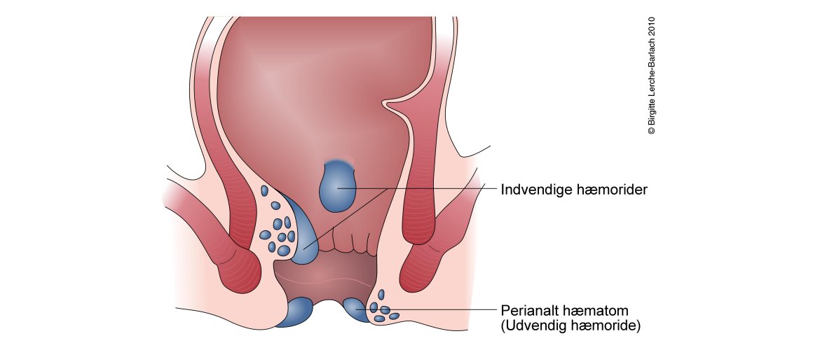 Figuren viser indvendige (internal) og udvendige (external) hæmorider: Illustration af hæmorider . Elastikbehandling kan anvendes til indvendige hæmorider. Udvendige hæmorider må oftest fjernes ved operation.